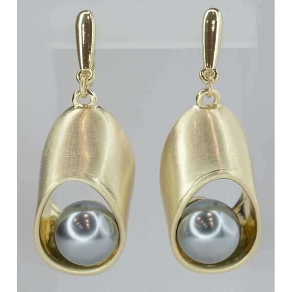 Серьги женские из гипоаллергенного ювелирного сплава желтого цвета. Вставка- жемчуг иск. серого цвета. Высота серег-3,0см, ширина-1,5см. Замок- английский (штифт-1,0см).