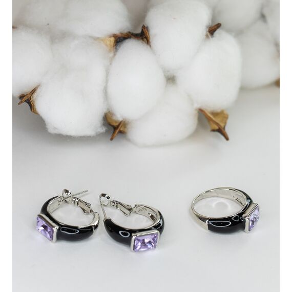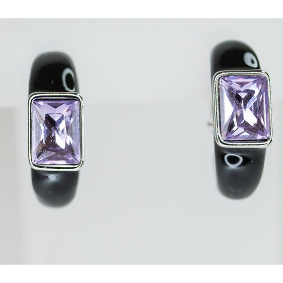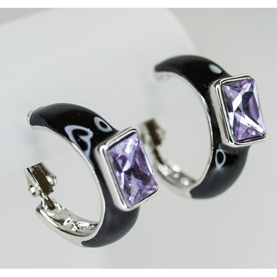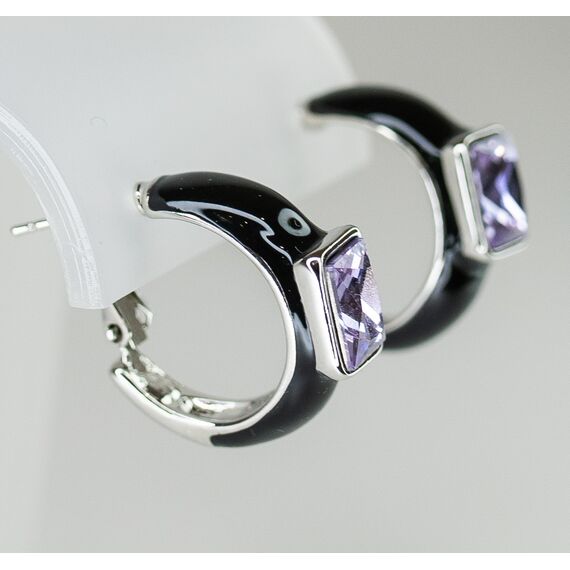 Серьги женские из гипоаллергенного ювелирного сплава серого цвета. Покрытие эмалью черного цвета. Вставка- ювелирное стекло сиреневого цвета. Высота серег-2,0см, ширина-1,0см. Итальянский замок ( штиф-1,2см и застежка- клипса).