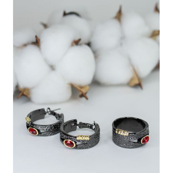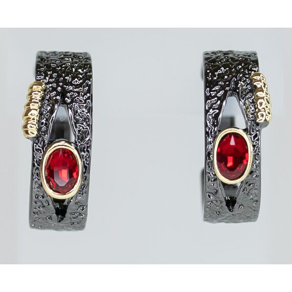 Серьги женские из гипоаллергенного ювелирного сплава черного и желтого цвета. Вставка- ювелирное стекло красного цвета. Высота серег-2,0см, ширина-1,0см. Итальянский замок ( штиф-1,2см и застежка- клипса).