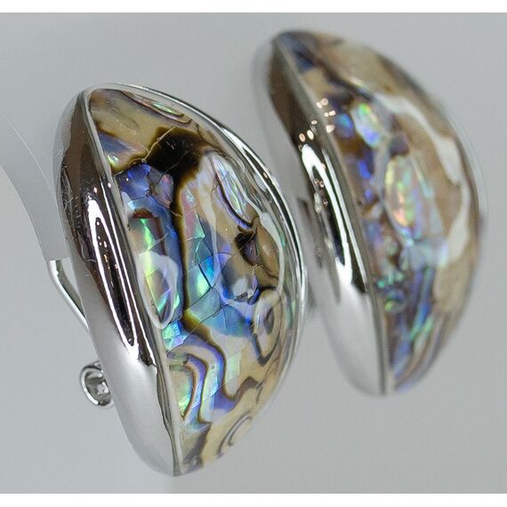Серьги женские из гипоаллергенного ювелирного сплава серого цвета. Вставка- перламутр радужного цвета. Высота серег-3,0см, ширина -2,5см. Итальянский замок (штифт-1,2см и застежка- клипса).