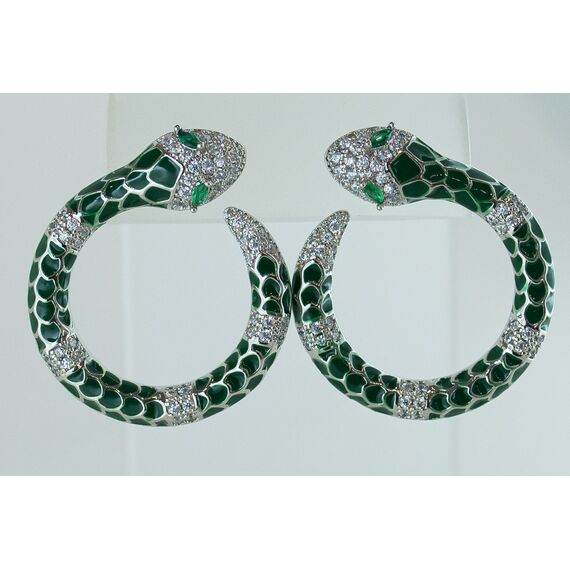 Серьги женские из гипоаллергенного ювелирного сплава серого цвета. Вставка- цирконы белого и зеленого цвета. Покрытие эмалью зеленого цвета. Высота серег- 2,5см.,ширина-2,5см. Застежка- пусет.