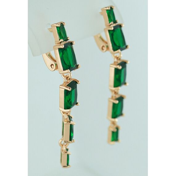 Серьги женские из гипоаллергенного ювелирного сплава желтого цвета. Вставка- кварц зеленого цвета. Высота серег- 4,0см, ширина-0,5см. Застежка- английская ( штифт-1,0см).