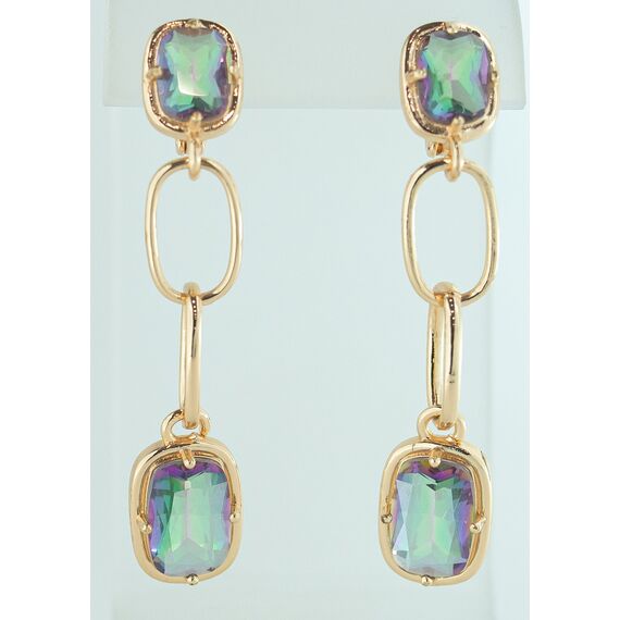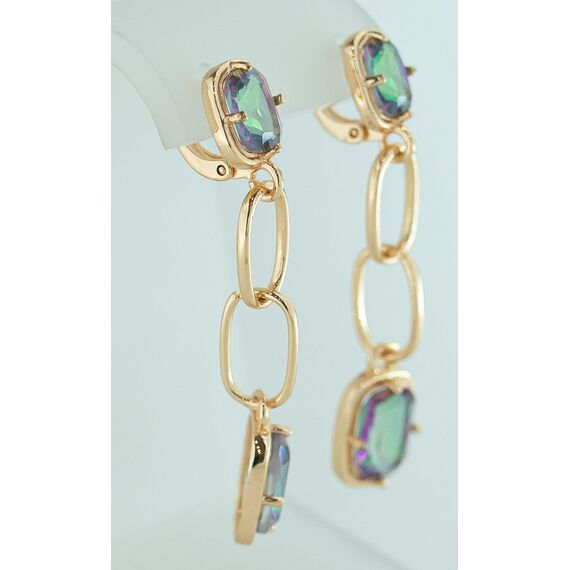 Серьги женские из гипоаллергенного ювелирного сплава желтого цвета. Вставка- кварц, цвет- мистик. Высота серег- 5,0см, ширина-1,5см. Застежка- английская ( штифт-1,0см).