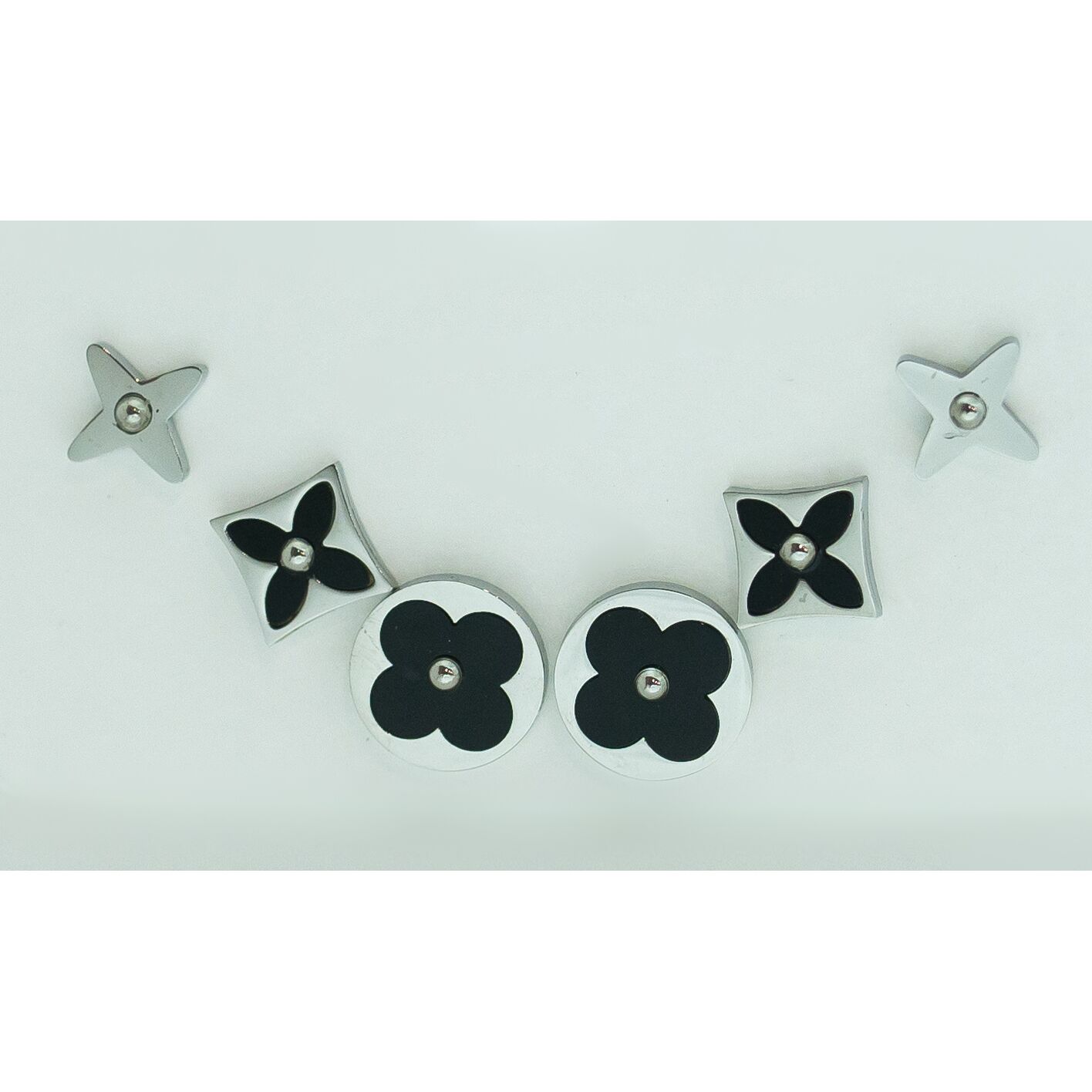 Серьги женские (в комплекте -3 пары) из гипоаллергенного ювелирного сплава серого цвета. Вставка- покрытие эмалью черного цвета. Высота серег- 1,0см, ширина-1,0см. Застежка- пусет.