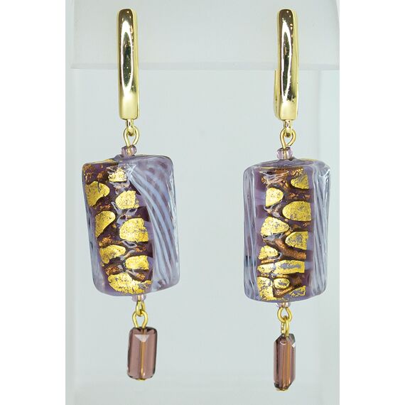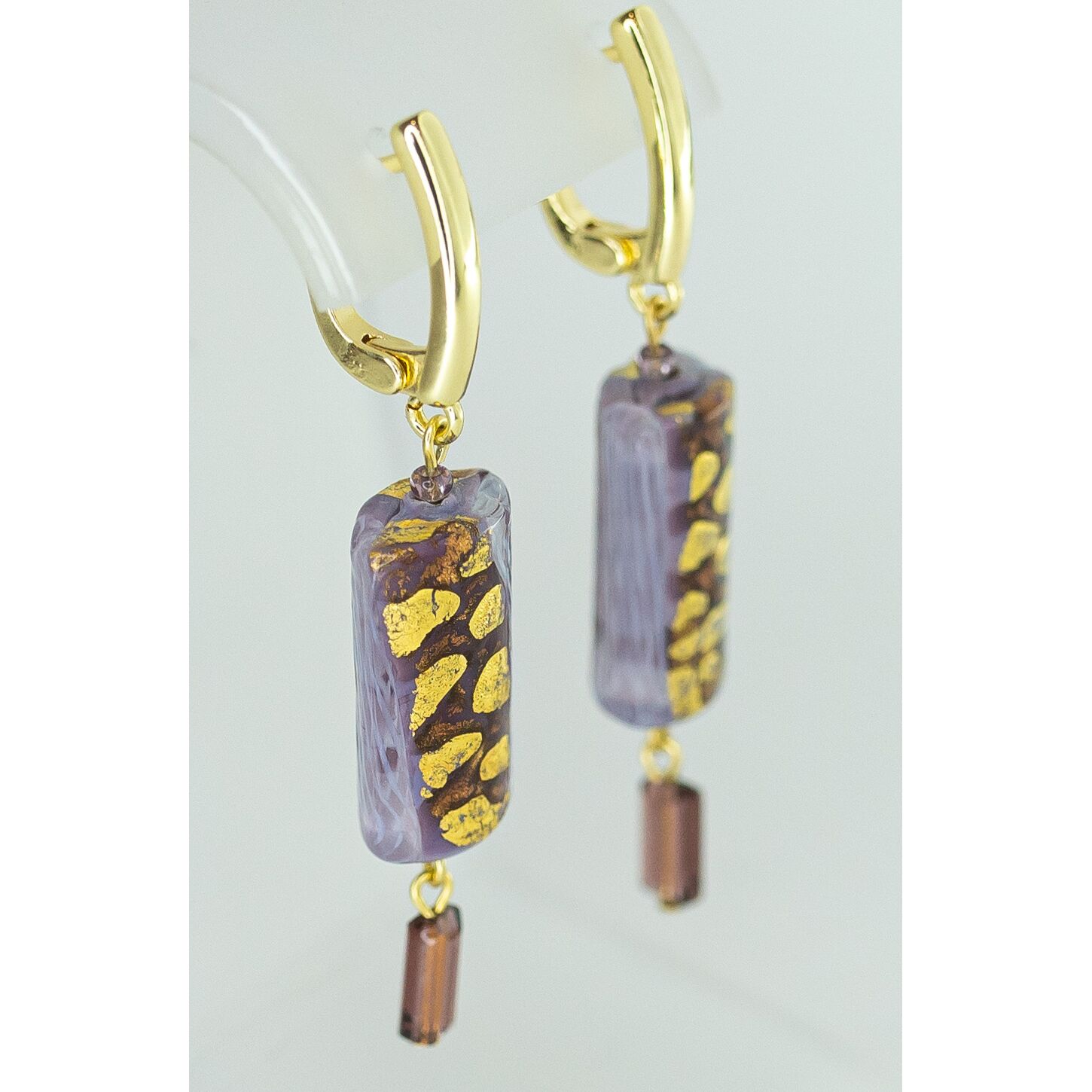 Серьги женские из гипоаллергенного ювелирного сплава желтого цвета. Вставка- Муранское стекло, цвет-фиолетовый, желтый. Высота серег- 4,0см, ширина-2,0см. Замок- английский (штифт-1,0см).