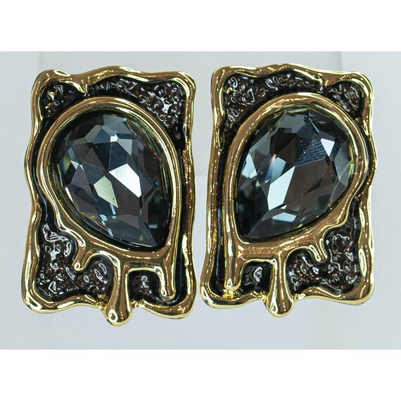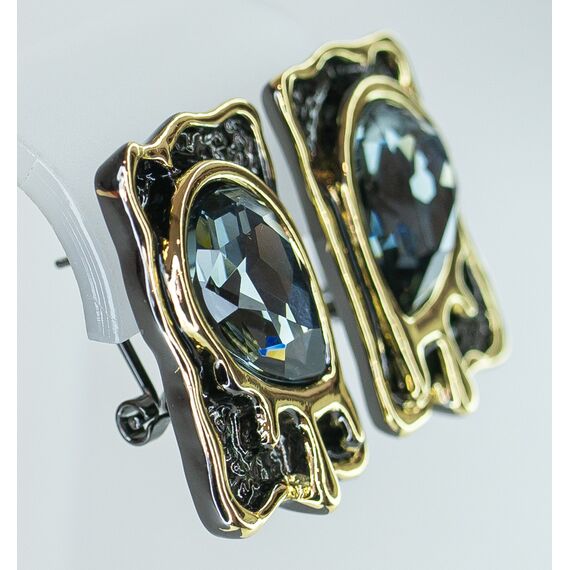 Серьги из гипоаллергенного ювелирного сплава черного и желтого цвета. Вставка- кварц, цвет-серый. Высота серег-3,0см, ширина-2,0см. Итальянский замок (штифт-1,2см и застежка- клипса).