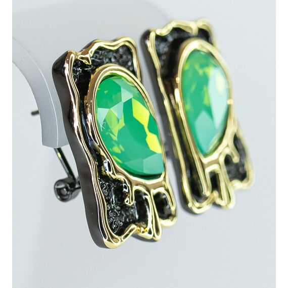 Серьги женские из гипоаллергенного ювелирного сплава черного и желтого цвета. Вставка- кварц зеленого цвета. Высота серег-3,0см, ширина-2,0см. Итальянский замок ( штифт-1,2см и застежка- клипса).