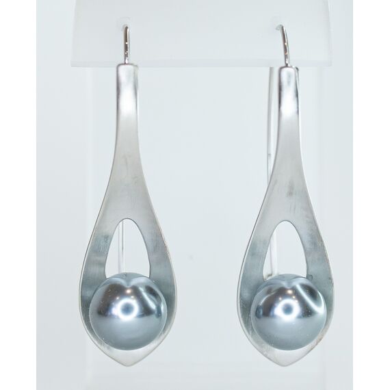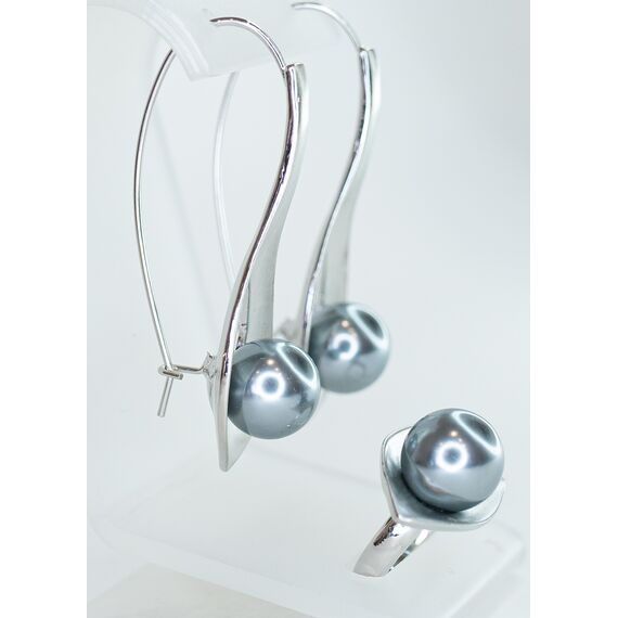Серьги женские из гипоаллергенного ювелирного сплава серого цвета. Вставка- жемчуг Майорка серого цвета. Высота серег-5,0см, ширина-1,5см. Застежка- петля.