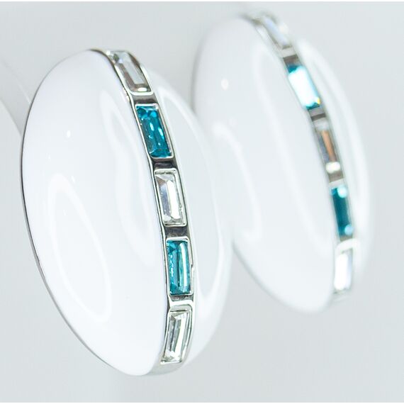 Серьги женские из гипоаллергенного ювелирного сплава серого цвета. Вставка- кварц белого и голубого цвета. Покрытие эмалью белого цвета. Высота серег-3,0см, ширина-2,5см. Итальянский замок (штифт-1,2см и застежка- клипса).
