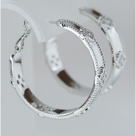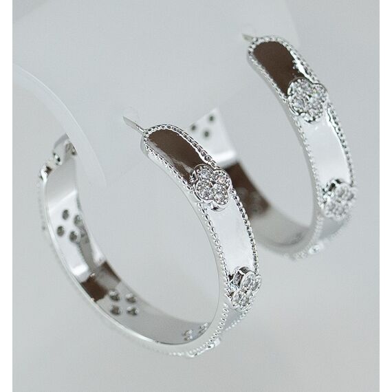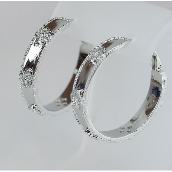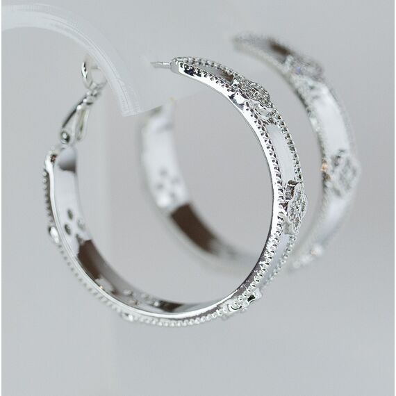 Серьги женские из высококачественного гипоаллергенного ювелирного сплава серого цвета. Вставка- циркон белого цвета. Высота серег-3,0см, ширина-1,0см. Застежка- итальянская ( штифт-1,02см и клипса).