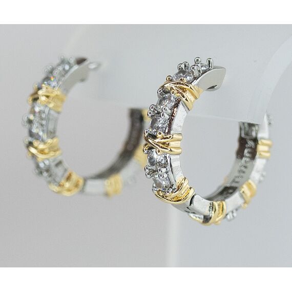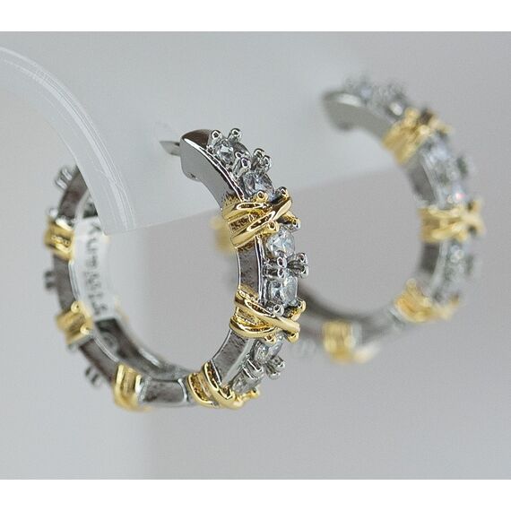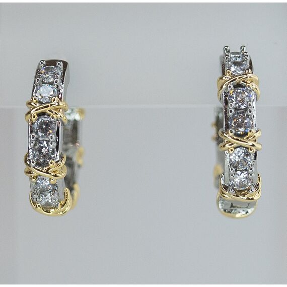 Серьги женские из высококачественного ювелирного сплава серого и желтого цвета. Вставка- цирконы белого цвета. Высота серег-2,0см, ширина-0,5см. Застежка- конго.