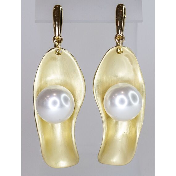 Серьги женские из гипоаллергенного ювелирного сплава желтого цвета. Вставка- жемчуг майорка белого цвета. Высота серег-6,0см, ширина -2,0см. Английский замок ( штифт-1,0см).