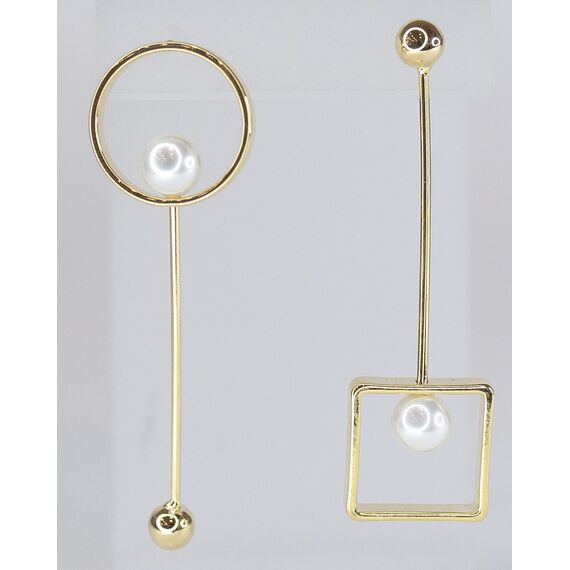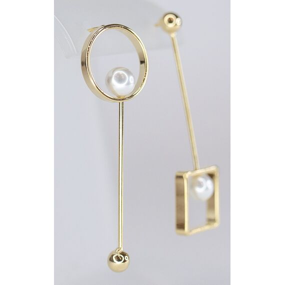 Серьги женские непарные из гипоаллергенного ювелирного сплава желтого цвета. Вставка- иск.жемчуг, цвет- белый. Высота серег- 5,0см, ширина- 2,0см. Застежка- пусет.