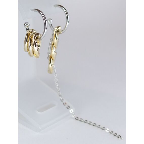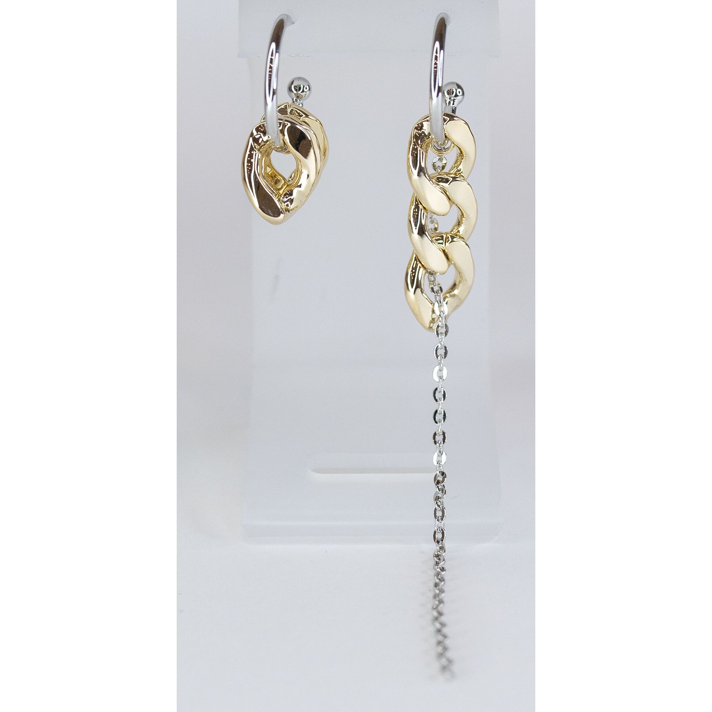 Серьги женские непарные из гипоаллергенного ювелирного сплава желтого и серого цвета. Без вставок. Высота серег- 2,0см, ширина- 1,0см., серьга с цепочкой-6,0см. Застежка- пусет.