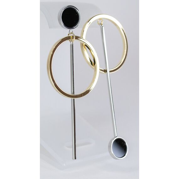 Серьги женские непарные из гипоаллергенного ювелирного сплава желтого и серого цвета с покрытием эмалью черного цвета. Высота серег- 7,0см, ширина- 2,0см. Застежка- пусет.