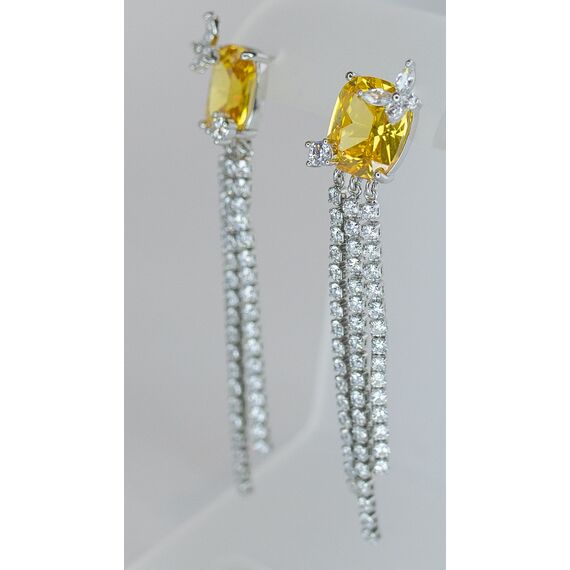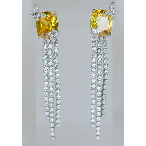 Серьги женские из гипоаллергенного ювелирного сплава серого цвета. Вставка- ювелирное стекло желтого и белого цвета. Высота серег- 5,0см, ширина- 1,0см. Замок- пусет.