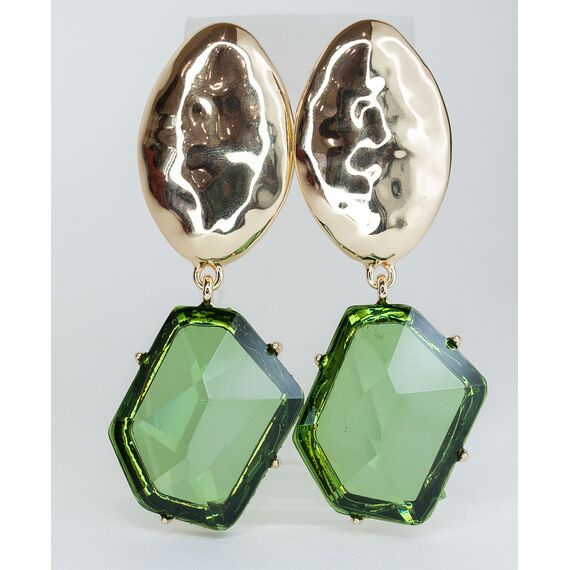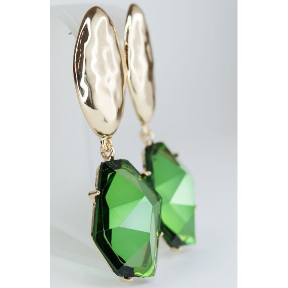 Серьги женские из гипоаллергенного ювелирного сплава желтого цвета. Вставка- циркон зеленого цвета. Высота серег- 8,0см, ширина- 2,0см. Замок- пусет.