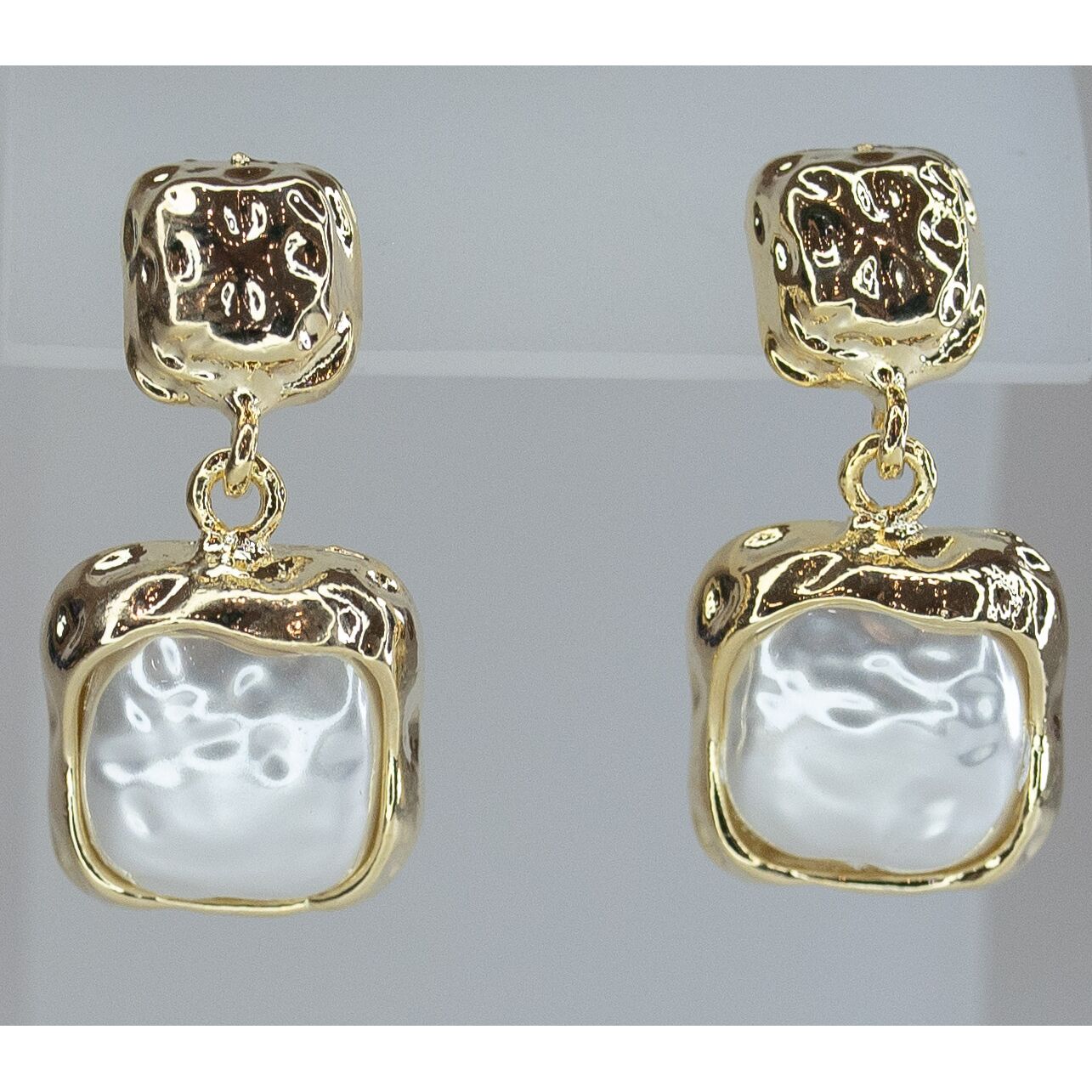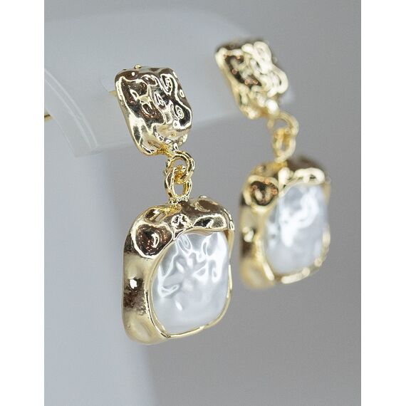 Серьги женские из гипоаллергенного ювелирного сплава желтого цвета. Вставка- иск. жемчуг белого цвета. Высота серег- 2,5см, ширина- 1,5см. Застежка- пусет.