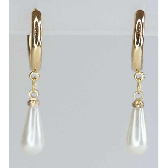 Серьги женские из гипоаллергенного ювелирного сплава желтого цвета. Вставка- иск. жемчуг белого цвета. Высота серег- 3,0см, ширина- 1,0см. Застежка- булавка.