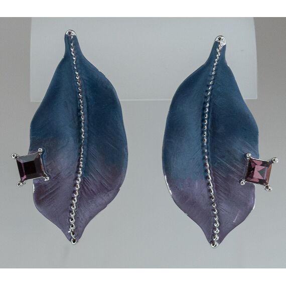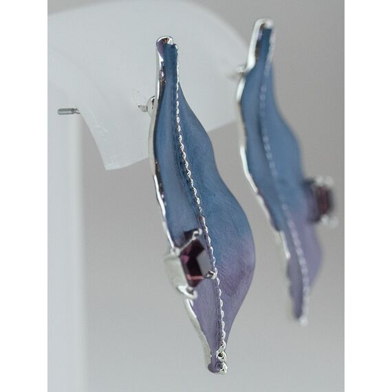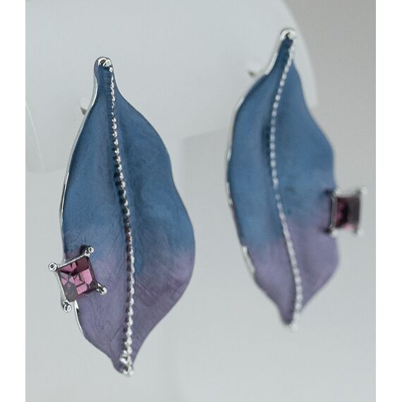 Серьги женские из гипоаллергенного ювелирного сплава серого цвета с напылением эмалью сине-фиолетового цвета. Вставка- кварц, цвет- фиолетовый. Высота серег- 4,0см, ширина- 2,0см. Застежка- пусет.