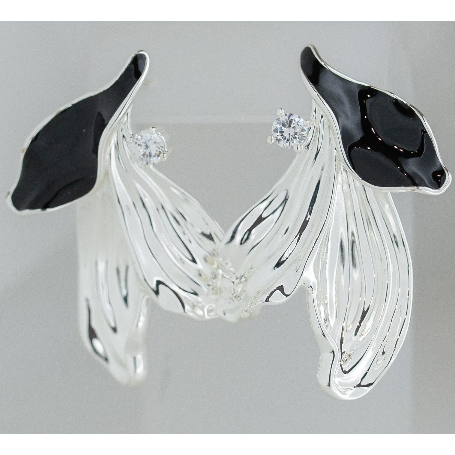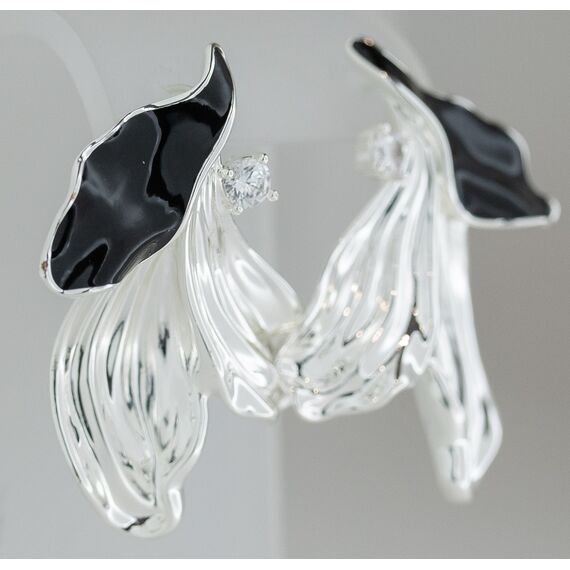 Серьги женские из гипоаллергенного ювелирного сплава серого цвета с покрытием эмалью черного цвета. Без вставок. Высота серег- 5,0см, ширина- 3,5см. Застежка- пусет.