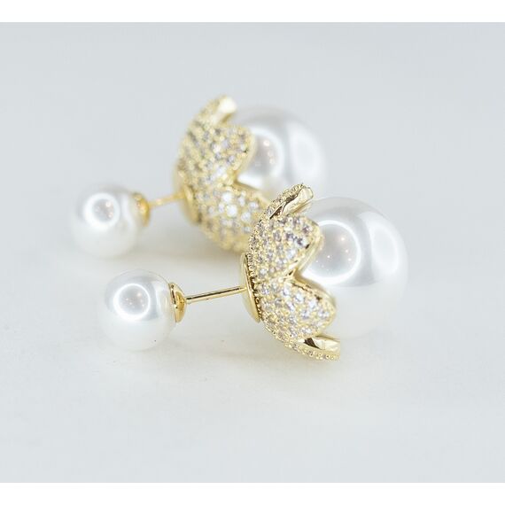 Серьги женские из гипоаллергенного ювелирного сплава желтого цвета. Вставка- жемчуг иск. белого цвета. Высота серег- 1,5см, ширина- 1,5см. Застежка- пусет.