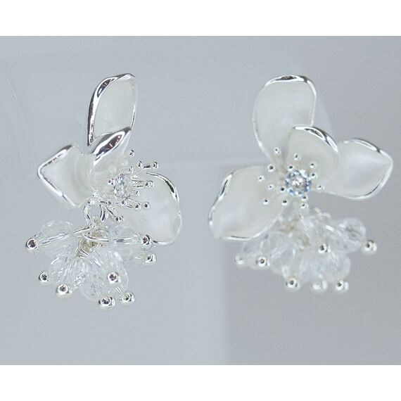Серьги женские из гипоаллергенного ювелирного сплава серого цвета с покрытием перламутром белого цвета. Вставка- ювелирное стекло, цвет- белый. Высота серег- 2,0см, ширина- 2,0см. Застежка- пусет.