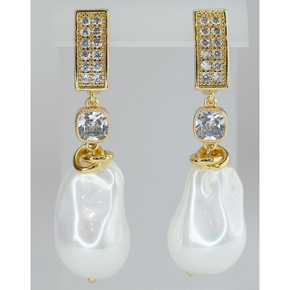 Серьги женские из гипоаллергенного ювелирного сплава желтого цвета. Вставка- майорка и цирконы белого цвета. Высота серег-5,0см, ширина-1,5см. Английский замок (штифт- 1,0см).