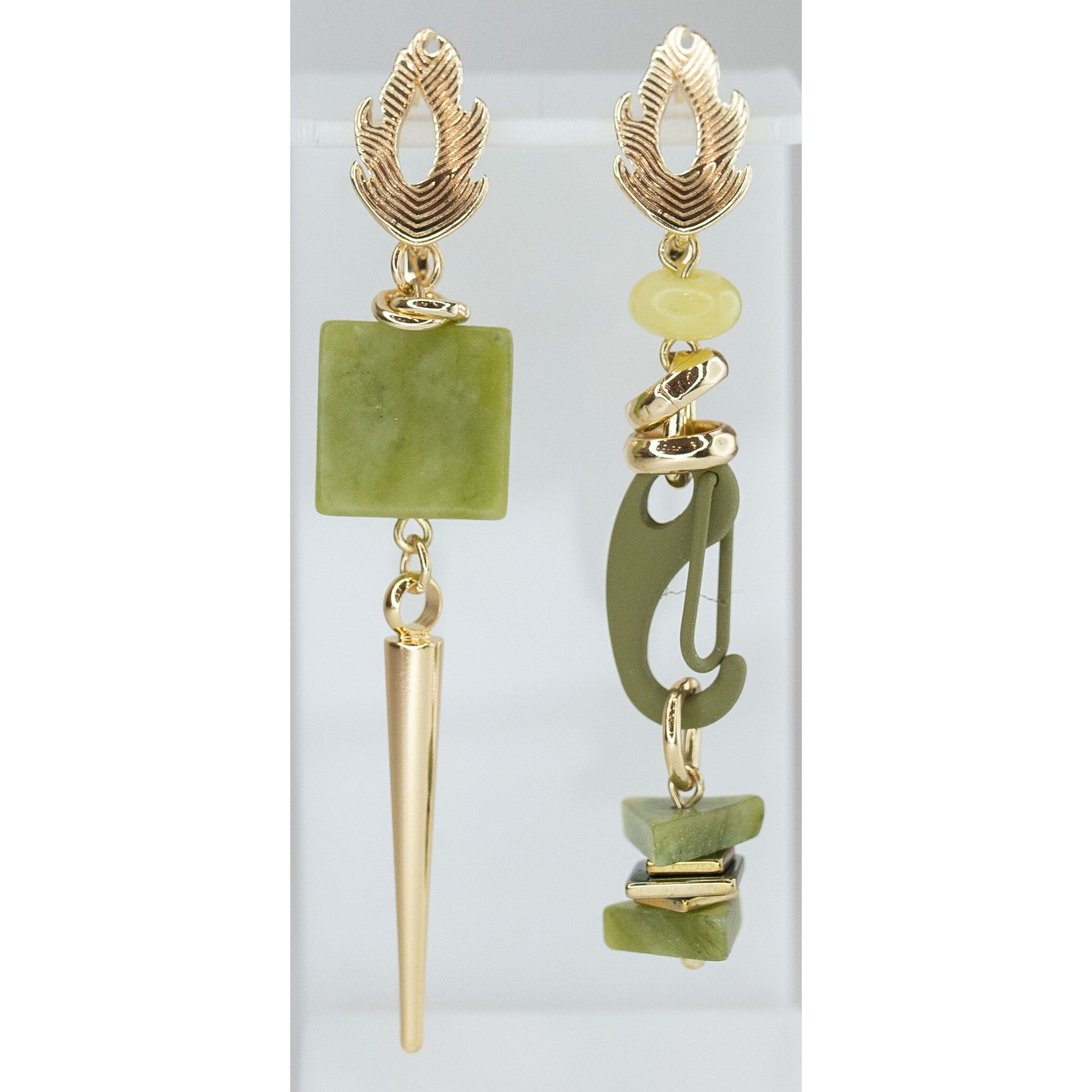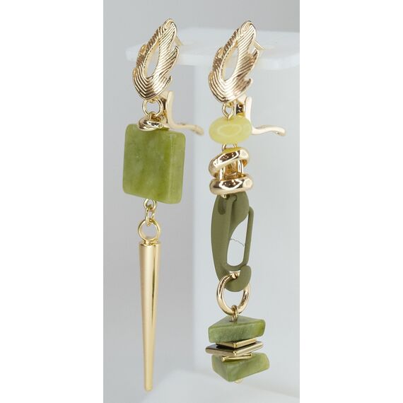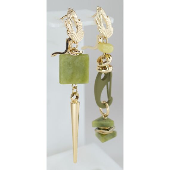Серьги женские асимметричные из гипоаллергенного ювелирного сплава желтого цвета. Вставка- нефрит зеленого цвета и гематит желтого цвета. Высота серег-6,0см, ширина-1,5см. Английский замок (штифт- 1,0см).