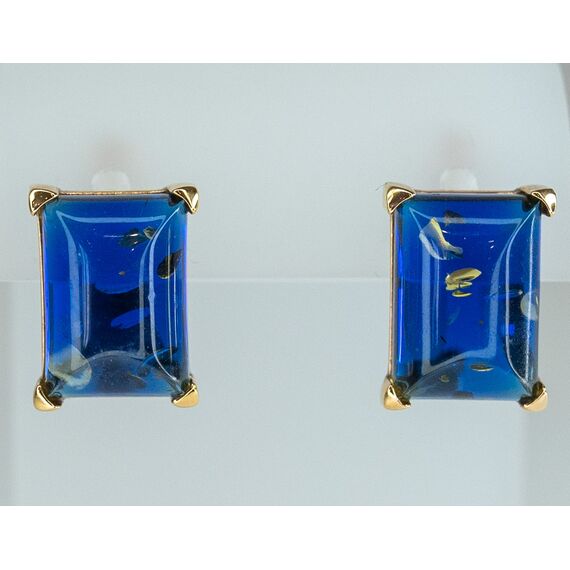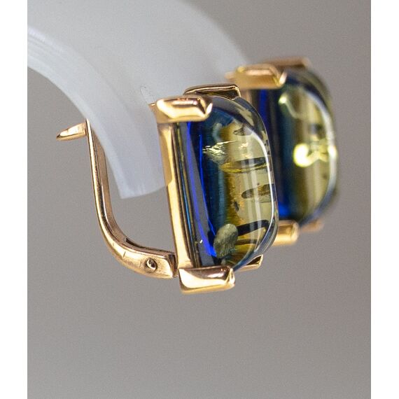 Серьги женские из гипоаллергенной бронзы с позолотой. Вставка- нат.янтарь синего цвета в форме прямоугольника ( размер камня-2,0/1,2см. Высота серег-2,0см, ширина-1,2см. Английский замок (штифт-1,0см).