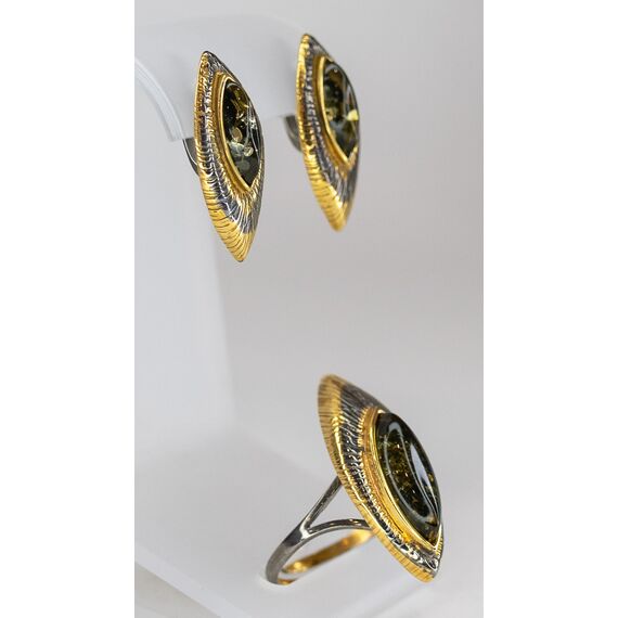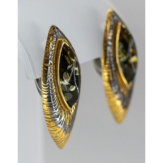Серьги женские из гипоаллергенной бронзы с позолотой и родием. Вставка- нат.янтарь зеленого цвета в форме удлиненного овала ( размер камня- 2,0/1,0см). Высота серег- 3,0см, ширина-1,5см. Застежка- английская (штифт-1,0см).