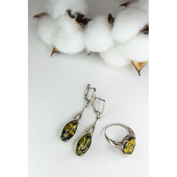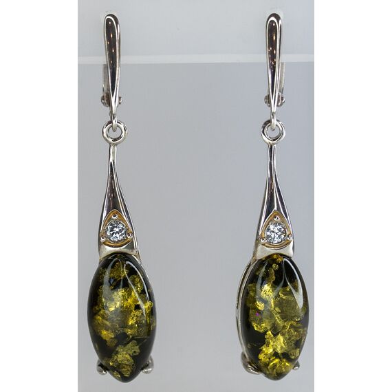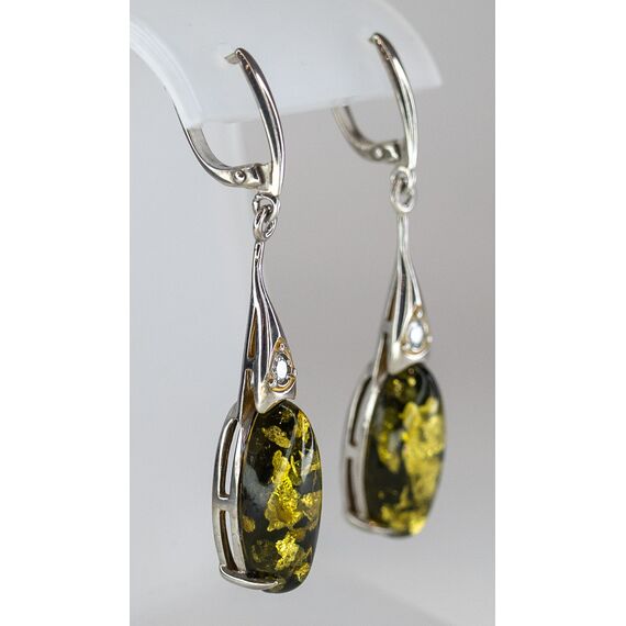 Серьги женские из гипоаллергенного ювелирного сплава серого цвета. Вставка- нат.янтарь пятнистый зеленого цвета ( размер камня- 2,0/1,5см) и фианит, цвет- белый. Высота серег- 5,0см, ширина-1,5см. Замок- английский (штифт-1,0см).