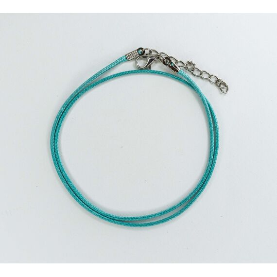 Шнурок из прорезиненного текстиля бирюзового цвета, длина-45,0+5см. Замок- карабин из ювелирного сплава серого цвета.