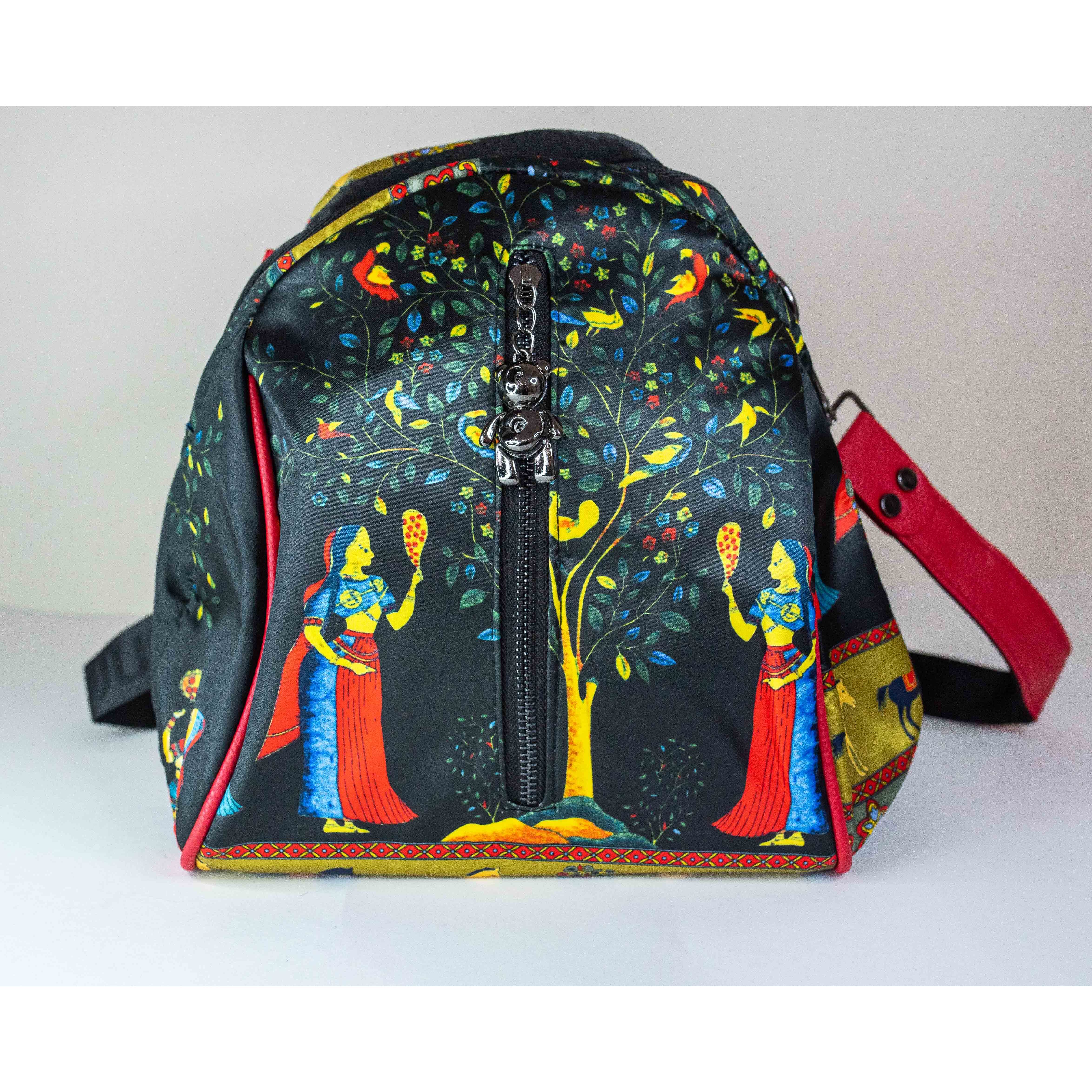 Рюкзак женский выполнен из водонепроницаемого текстиля с принтом черного, синего и красного цвета. Снаружи вместительные карманы на молнии черного цвета. Модель многофункциональна- подходит для путешествий и как городской. Лямки у рюкзака выполнены из тканевых и кожанных лент с металлическими пряжками. Высота рюкзака- 27,0см, ширина-20,0см.