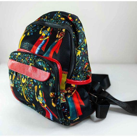 Рюкзак женский выполнен из водонепроницаемого текстиля с принтом черного, синего и красного цвета. Снаружи вместительные карманы на молнии черного цвета. Модель многофункциональна- подходит для путешествий и как городской. Лямки у рюкзака выполнены из тканевых и кожанных лент с металлическими пряжками, ручка выполнена из кожи красного цвета. Высота рюкзака- 27,0см, ширина-20,0см.