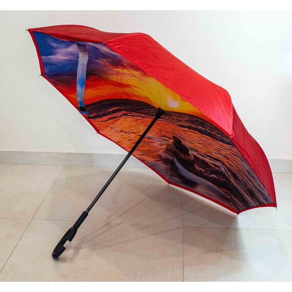 Зонт женский, полуавтомат- трость из водонепроницаемого синтетического материала с одной стороны с рисунком, с другой- красного цвета. Каркас- стальной с антикоррозийным покрытием с механизмом- антиветер. Ручка зонтика изготовлена из пластика черного цвета, предназначена для детских колясок. В комплект входит чехол (длина-80,0см).