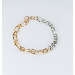 Браслет женский из гипоаллергенного ювелирного сплава серого и желтого цвета. Состоит из цепочных звеньев разных плнтений. Высота браслета-1,0см. Замок- карабин. Размер-18,0.