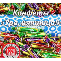 Конфеты "Ура, пятница!" в тёмной фирменной глазури со светлой пралиновой начинкой и вкусами: "вареная сгущенка", "карамелизированное молоко", "творожный крем". Согласно народной мудрости, пятница - это маленький праздник.
