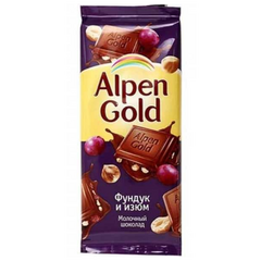 Шоколад молочный фундук и изюм “Альпен голд” – Классический молочный шоколад с добавлением дробленного фундука и пряного изюма.