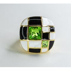 Кольцо из гипоаллергенного ювелирного сплава, цвет- желтый. Покрытие-эмаль черно-белого цвета, вставка- ювелирное стекло, цвет- зеленый. Размер- 17,0.