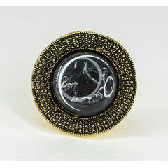 Кольцо женское из гипоаллергенного ювелирного сплава желтого цвета. Вставка- ювелирное стекло серого цвета. Покрытие эмалью черного цвета. Высота кольца---2,6см, ширина-2,6см. Размер-17,0.