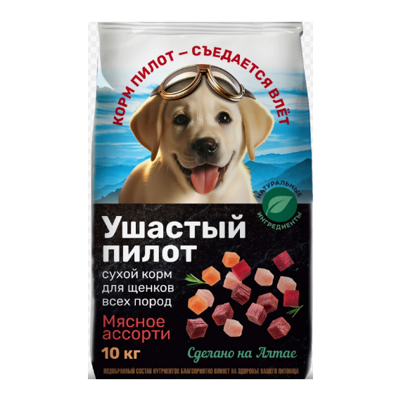 Собачий корм Ушастый пилот мясное ассорти - это самое лучшее, сбалансированное питание для щенков, которое создано специально, чтобы обеспечить вашего питомца всеми необходимыми полезными элементами, витаминами и миниралами.