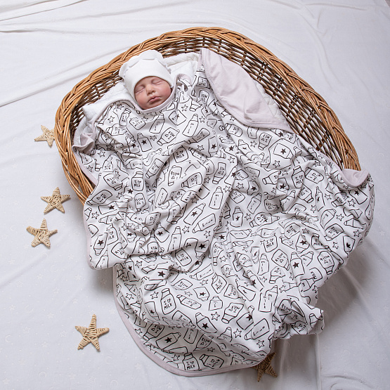 Двухслойный плед спокойных нейтральных оттенков подойдет на летнюю выписку, в качестве утепляющего слоя в холода, для комфорта в кроватке и коляске..