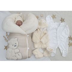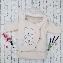 Комбинезон лапша, молочный Шикарные Мишки из приятной ткани "лапша", тёплая мерлушка и забавные ушки. Удобная застежка на молнии и теплый капюшон, отороченный мерлушкой, согреют малыша и подарят ему мягкость и комфорт. Подходит для выписки из роддома, на прогулки, как поддева в конверт....