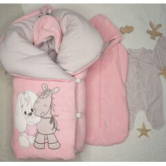 Основной материал – плотный трикотаж с рельефом "косичка" . Внутреннее наполнение комплекта выполнено в традиционном розово-нейтральном цвете для девочек. -Одеяло на пуговицах из плотного трикотажа "косичка", кулирка серо-бежевая (холстон 200гр на кв м в 2 слоя ) р-р 100х100 см -Комбинезон из...