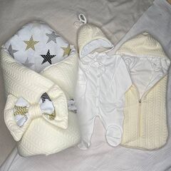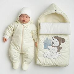 Конверт на 3 молниях в молочном цвете, с милой вышивкой. Размер 0-4 мес. Комбинезон молочный на рост 56-62. С капюшоном, ручки открыты, ножки закрыты. Утеплитель по сезону. Шапка вязаная на завязках молочного цвета. Размер 0-3 мес. Комплект упакован в фирменную сумку на молнию. Конверт идет...