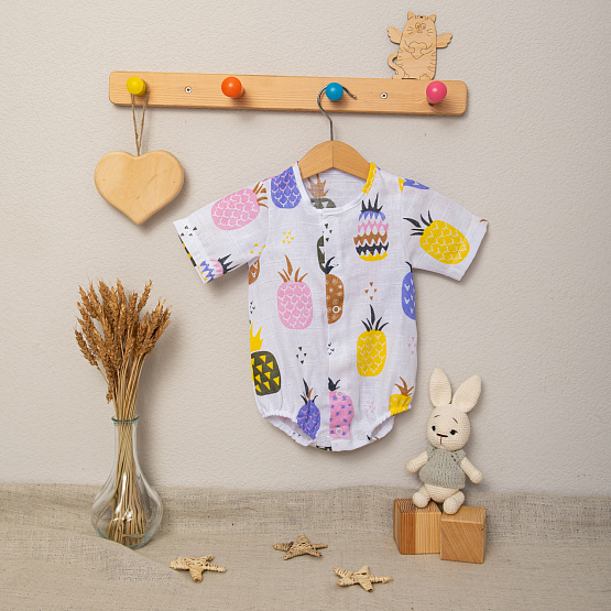 Легкий летний боди из модного муслина с набивным рисунком Ананасы.