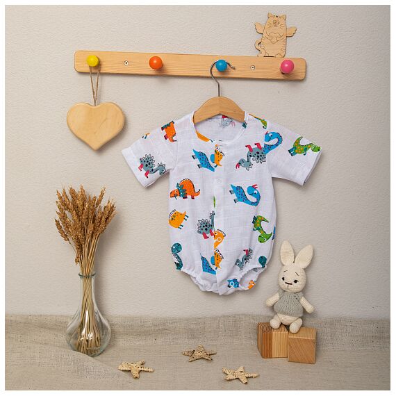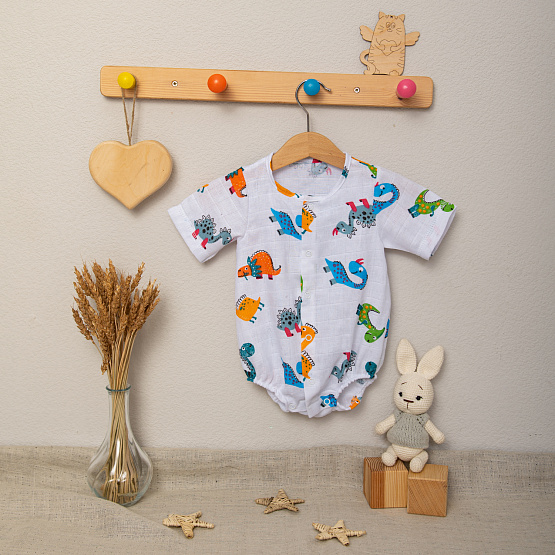 Легкий летний боди из модного муслина с набивным рисунком Динозаврики.
