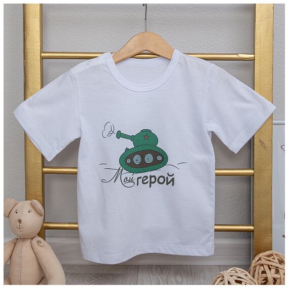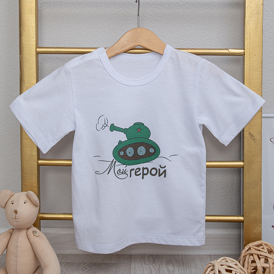 Футболка детская с праздничным принтом "Мой герой" , ткань кулирка белая, молочная, состав хлопок 100%