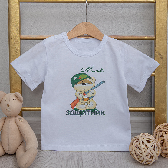 Футболка детская с праздничным принтом "Мой защитник" , ткань кулирка белая, молочная, состав хлопок 100%
